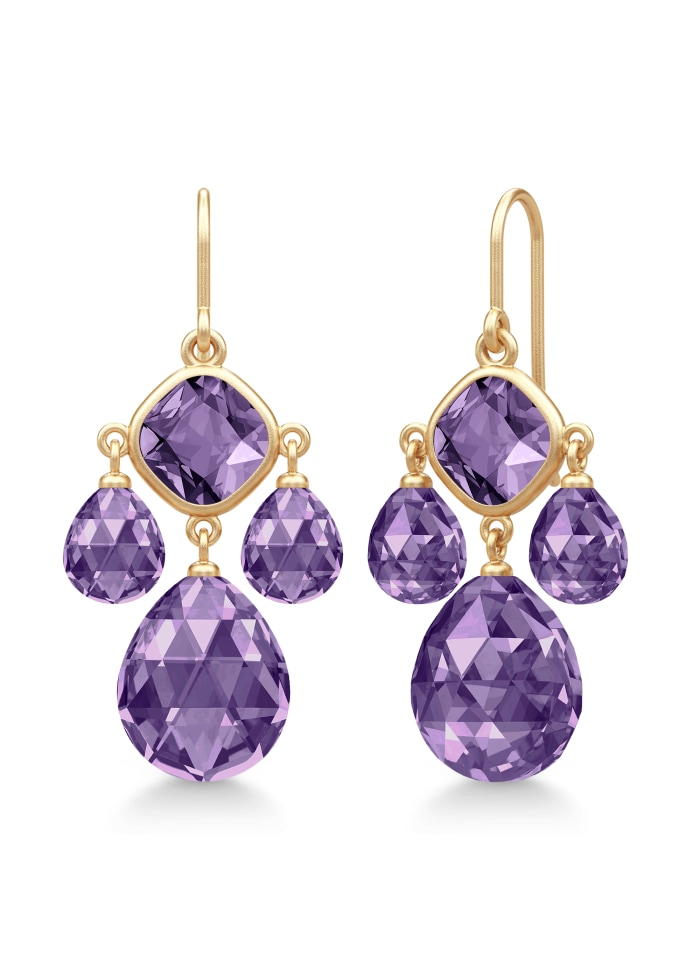 Beskrivelse Denne enestående Olivia Chandelier øreringen kombinerer eleganse og femininitet på en unik måte med sin fasetterte pute og pærebriolettkrystaller. Øredobben er laget i 22 karat gullbelagt 925 sterling sølv og har en vakker satengfinish. Denne lysekronen kan pares med et matchende Olivia-anheng for å skape et komplett og harmonisk utseende. - 22 karat forgylt 925 sterling sølv - Sateng finish - 35 mm x 17 mm |
