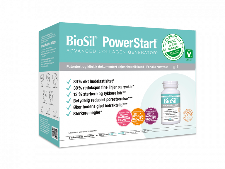 Beskrivelse Hva er Biosil®? Biosil® er et skjønnhetstilskudd, eller nutrikosmetikk, forsket frem og patentert i Belgia. Produktet ble lansert i 1994 og har vært på det internasjonale markedet i 25 år. Biosil har 1,3 millioner daglige bruker på verdensbasis. Patentert og klinisk dokumentert Biosil er patentert, klinisk dokumentert og prisvinnende. Det ligger forsknings- og utviklingskostnader til en verdi av mer enn 15 millioner euro bak produktet. Biosil er vegansk og inneholder ingen form for kollagen. Det aktive virkestoffet i BioSil er kolinstabilisert ortokiselsyre, som er godkjent av mattilsynet for bruk i kosttilskudd. |