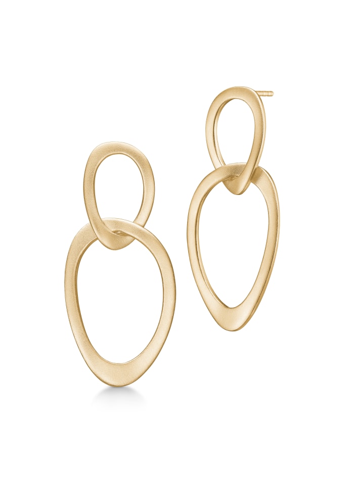 Beskrivelse Vakre øredobber i klassisk, organisk design med to lenker. Den organiske formen sitter perfekt på øret, og lenkene sitter sammen slik at de ikke snur og roterer. |